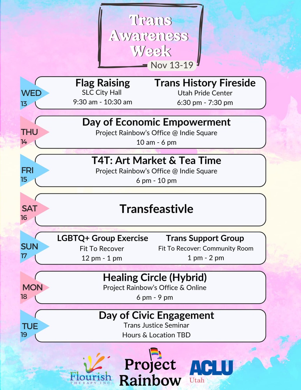 Come join Kendoll Clitzone and James-Katherine on Friday, November 15 and Saturday, November 16, as we celebrate Trans Awareness Week with Project Rainbow and Queer and Sober Utah!