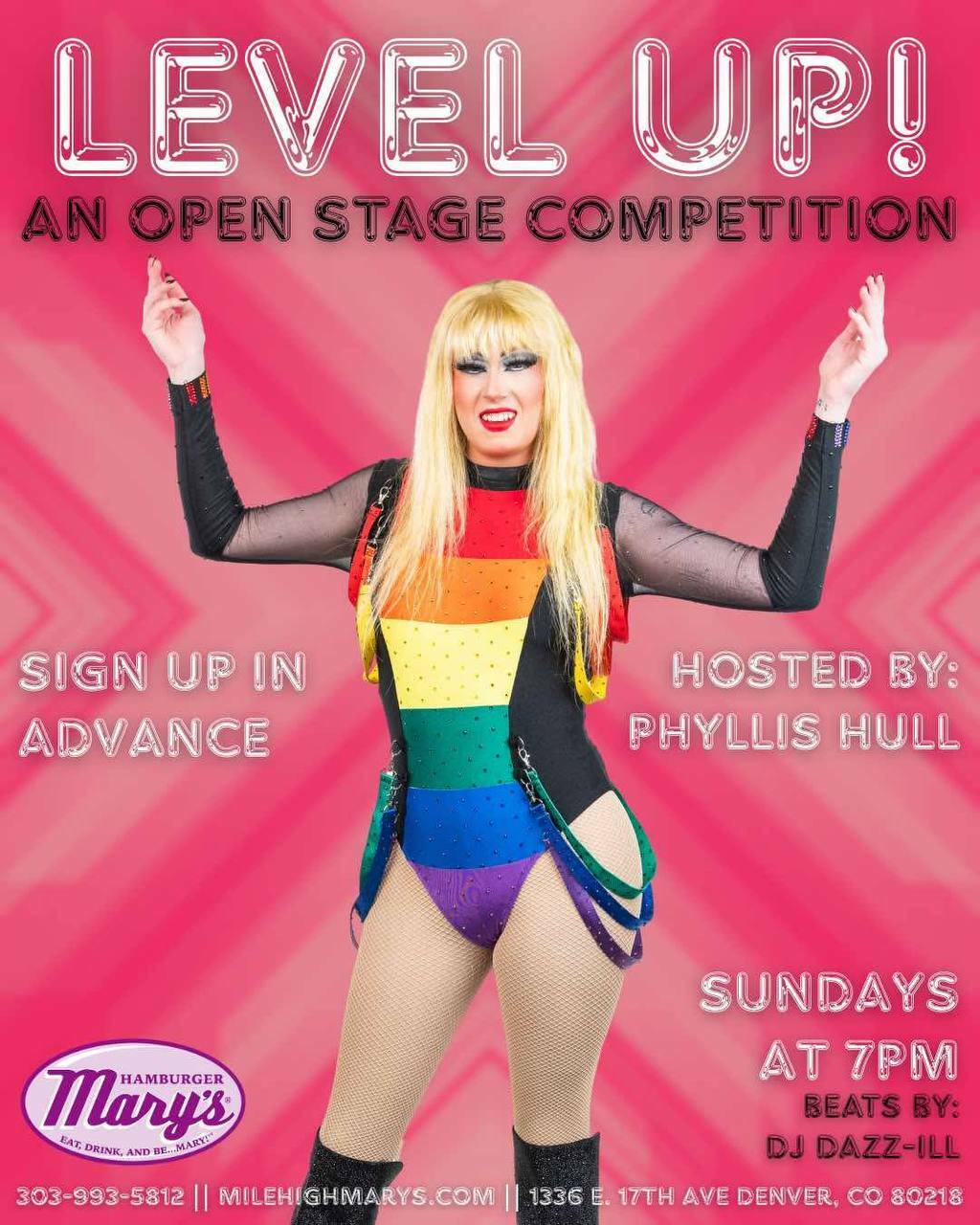 Kendoll Clitzone is on the stage again, for Level Up!, at Hamburger Mary's, once again! Join your host Phyllis Hull for an evening of comedy, drag, and a great time for all!