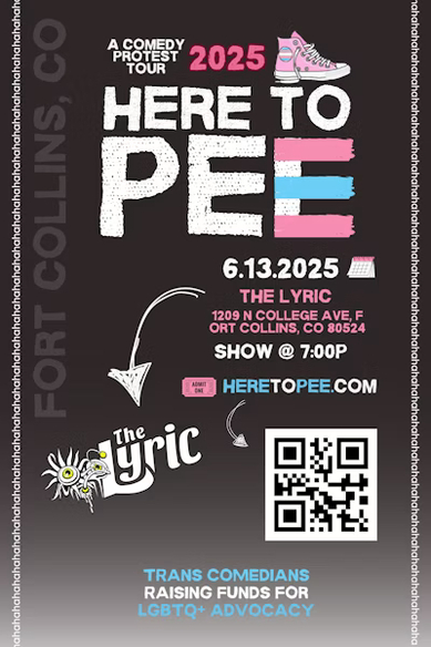 The "Here to Pee" tour is more than a comedy show; it's a movement to flush away discriminatory laws through the power of humor. By supporting this tour, you are helping to create a platform for trans rights and equality, connecting communities through shared experiences and laughter. All proceeds are donated to local LGBTQ+ non-profits battling anti-LGBTQ+ ballot initiatives on the local level.