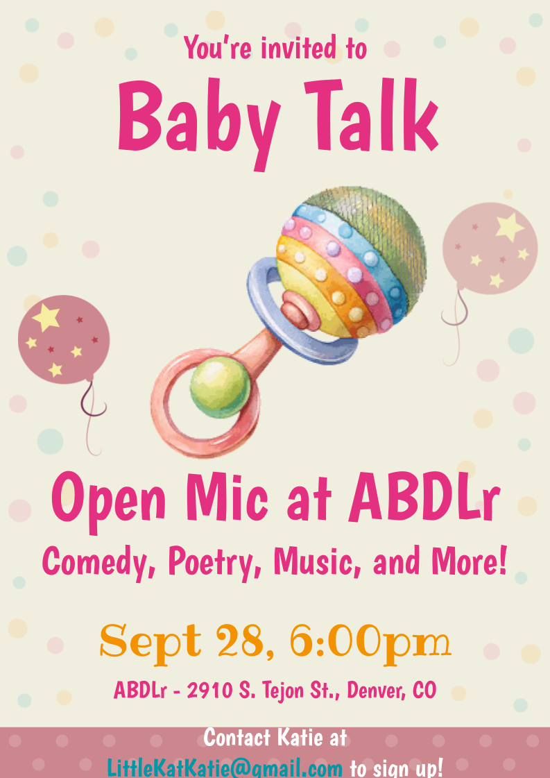 Kendoll and Katherine are proud and excited to welcome you to Father Figure Productions debut show, Baby Talk! Join us as we host the brand new Open Mic night, every final Sunday of the month, at ABDLr, in Denver, CO!